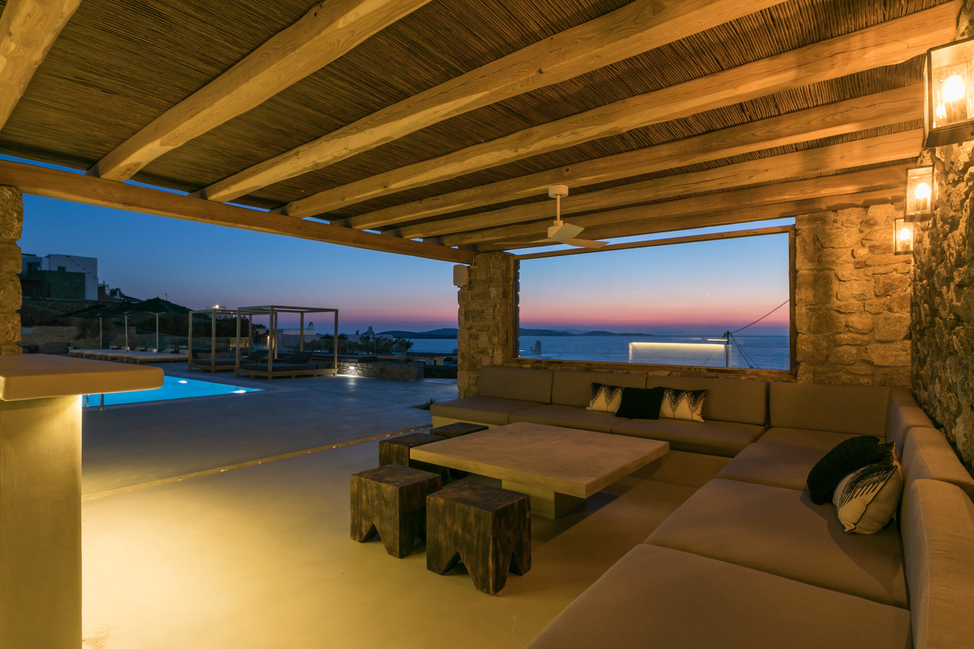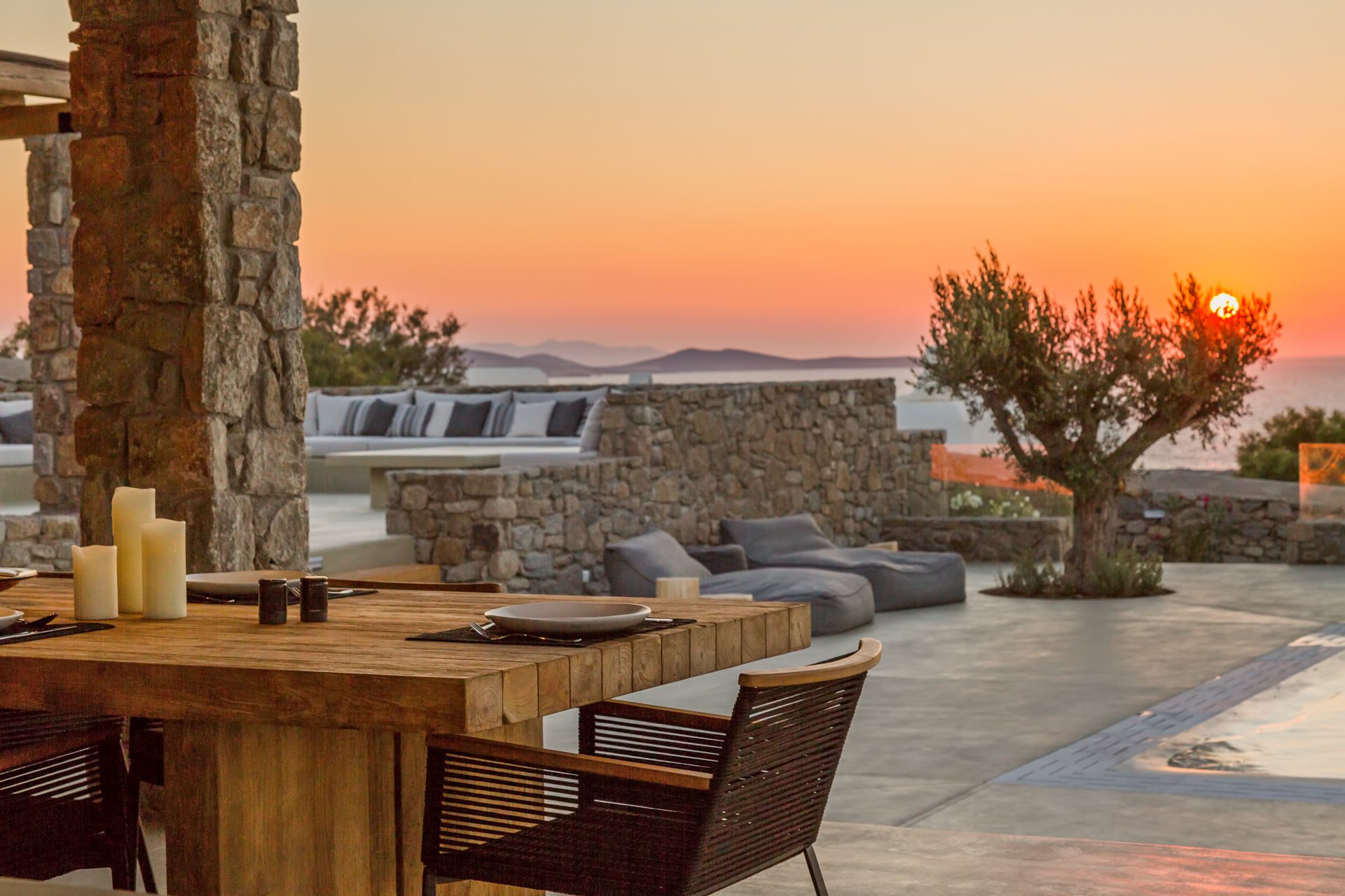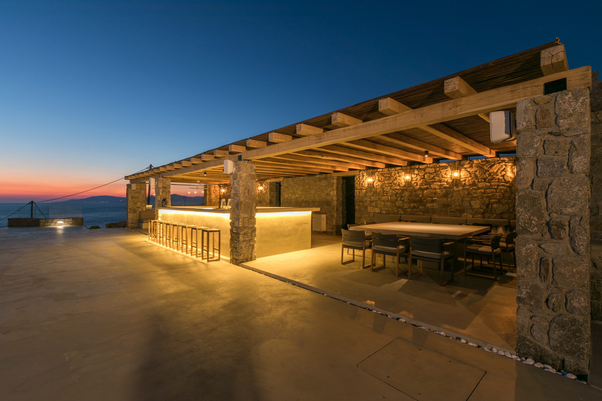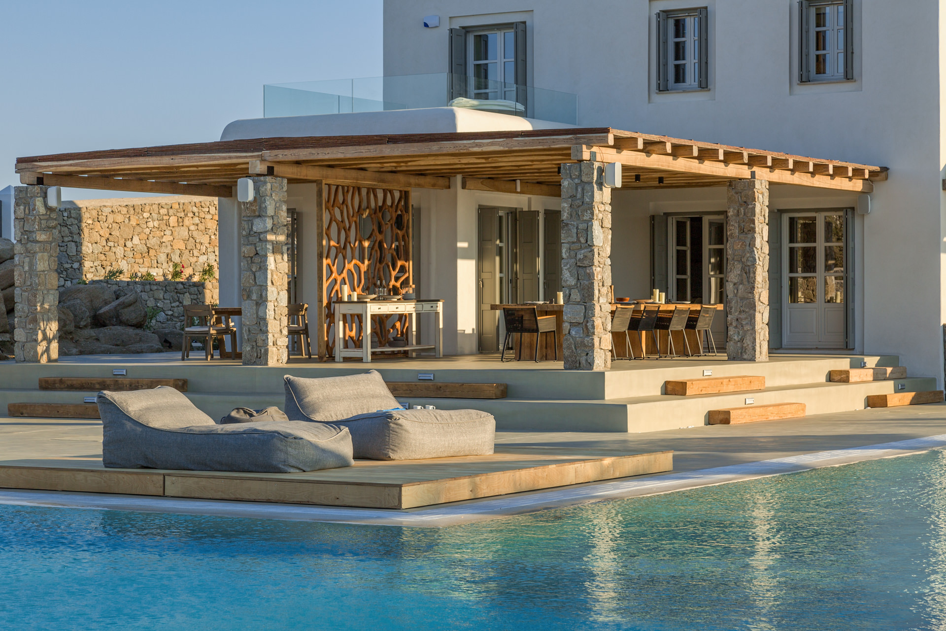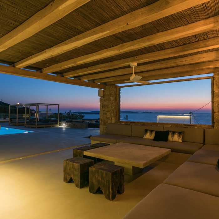 The stylish villa is a chic and unique property with spectacular views over the crystal clear Aegean waters. The impeccably designed, modern interior consists of the large living room, the kitchen and the dining area (open plan) and the 3 spacious en suite bedrooms with their private balconies. One additional en suite bedroom may be found in the guest house, which has a private entrance. The vast outdoor area features the 25 m x 17 m pool, the exterior dining area, the BBQ and the pool bar, while guests may enjoy the sunset and spend their time in the lounge and sitting areas in and around the pool, which provide the perfect place to relax on a warm summer day.
