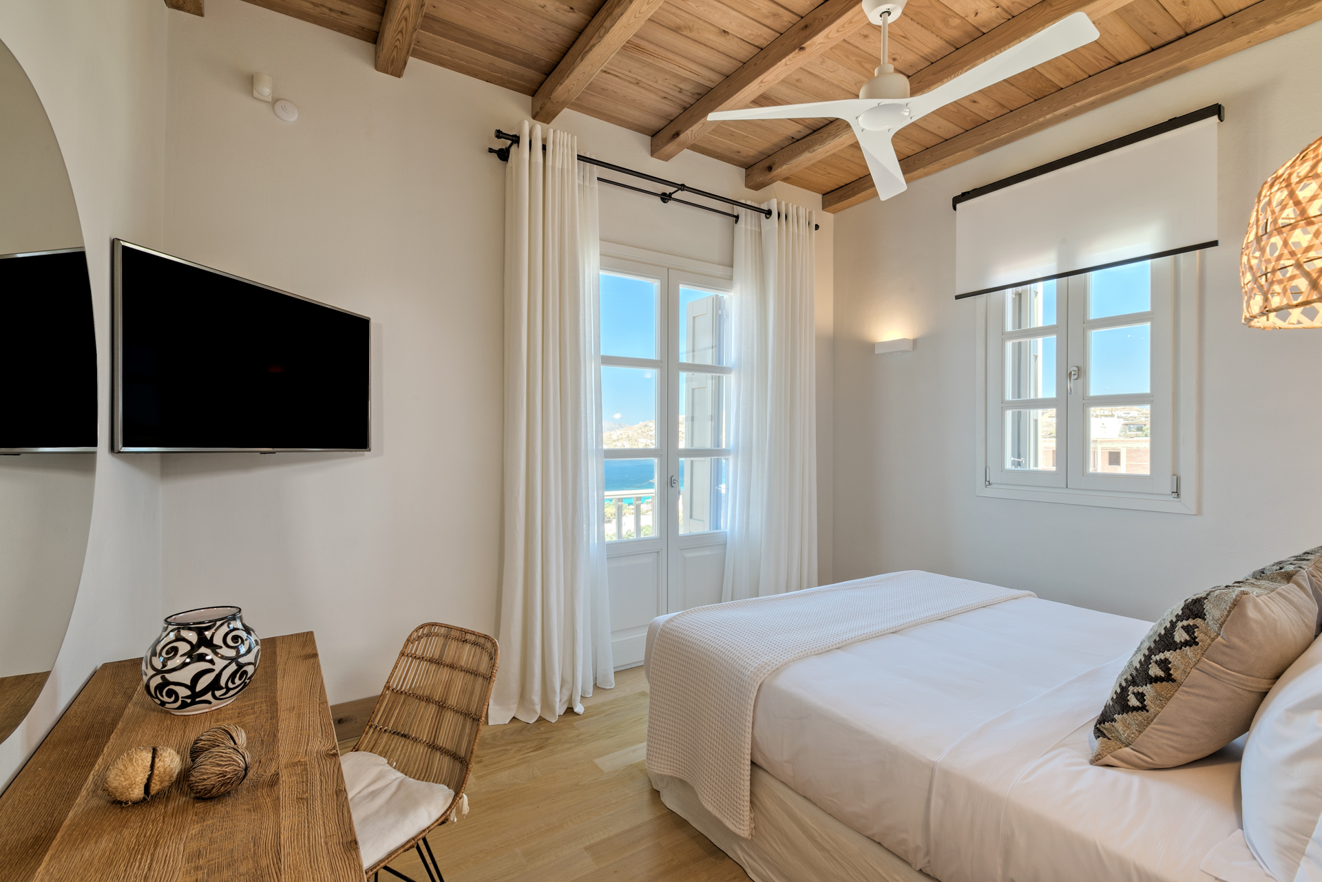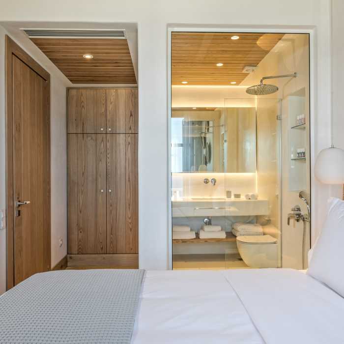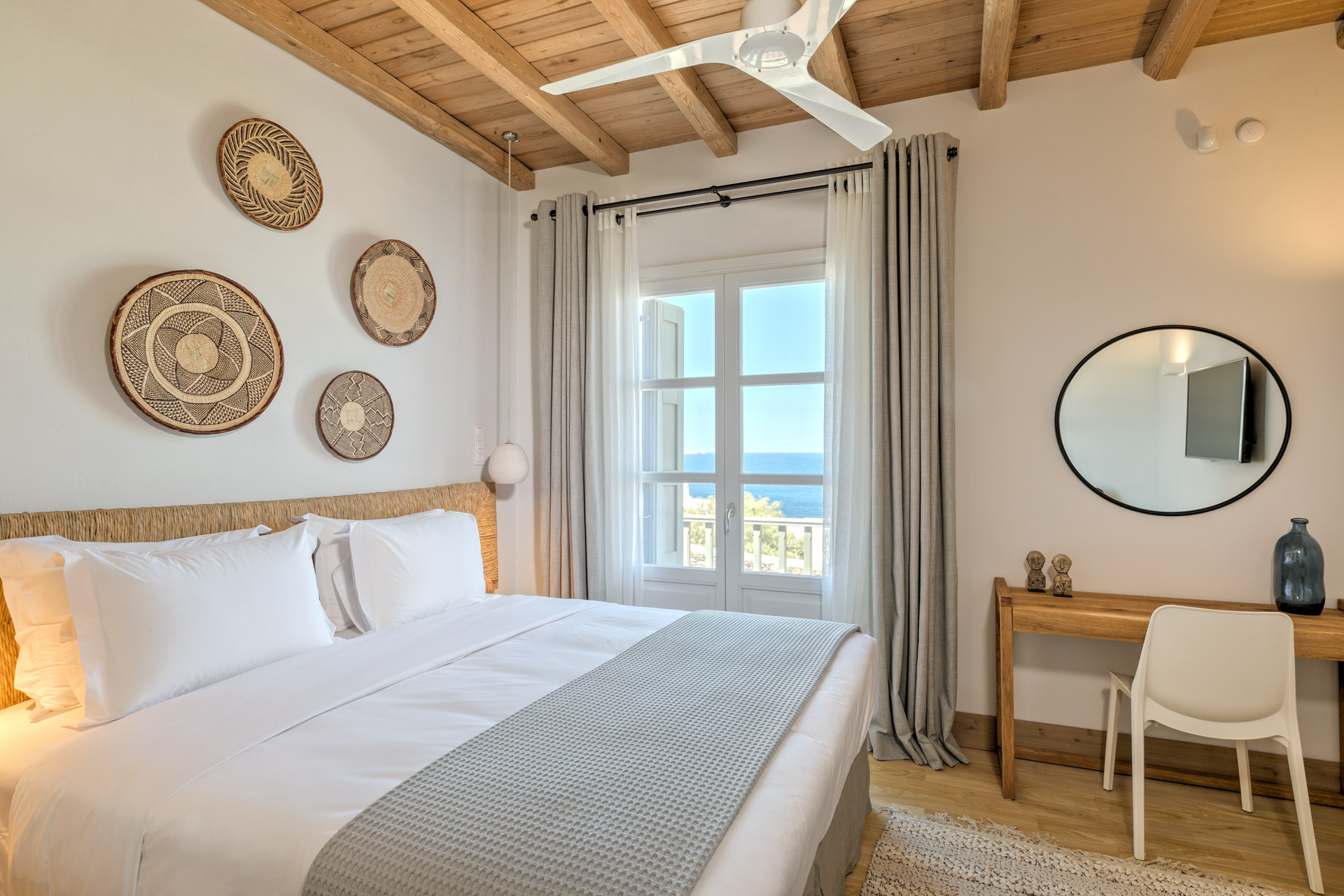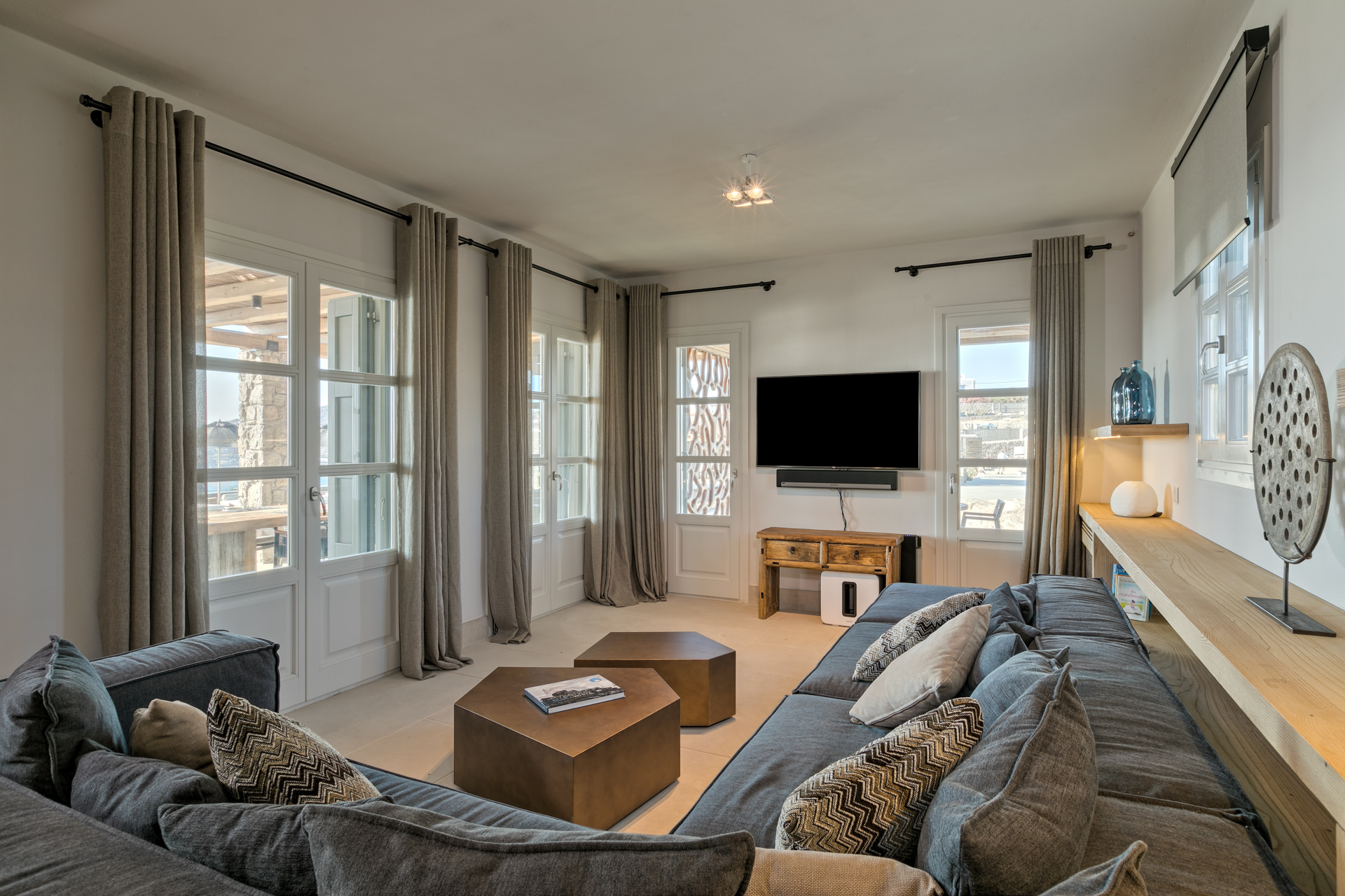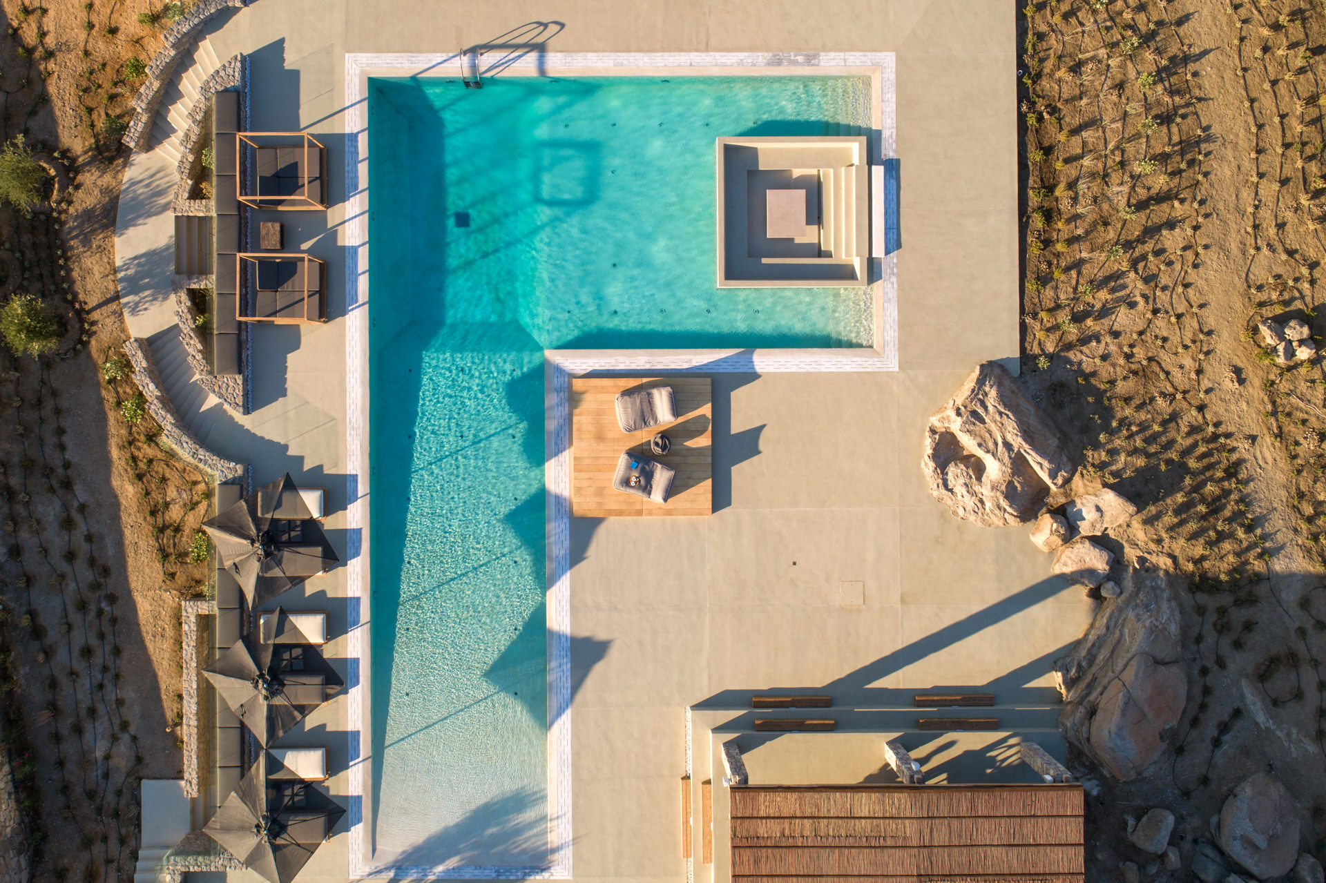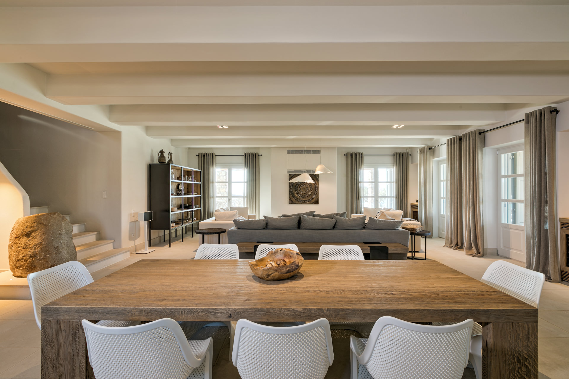 The stylish villa is a chic and unique property with spectacular views over the crystal clear Aegean waters. The impeccably designed, modern interior consists of the large living room, the kitchen and the dining area (open plan) and the 3 spacious en suite bedrooms with their private balconies. One additional en suite bedroom may be found in the guest house, which has a private entrance. The vast outdoor area features the 25 m x 17 m pool, the exterior dining area, the BBQ and the pool bar, while guests may enjoy the sunset and spend their time in the lounge and sitting areas in and around the pool, which provide the perfect place to relax on a warm summer day.